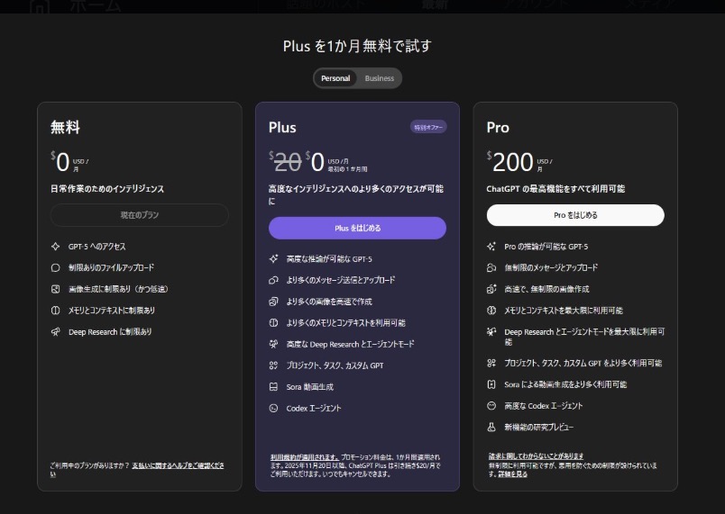 ChatGPT Plusが「1ヶ月無料お試し」が